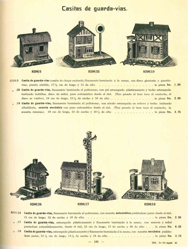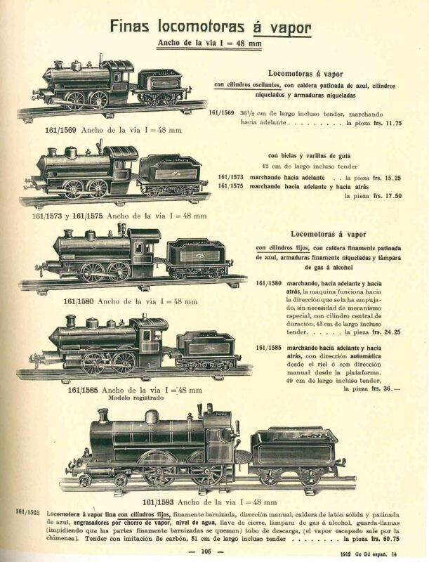 Moving into the 20th century, we have this scarce trade catalog of German toys for the Spanish market. The catalog was printed in Nuremberg in 1912 for Gebrüder Bing, a German toy company founded in 1863 which started their business producing metal tableware and utensils before moving to toy production. They ended up becoming best-known for their toy trains and live steam engines. This particular catalog covers a wide range of their offerings and provides detailed descriptions, measurements, and prices of toys such as steam engines, steam trains, ships, automobiles, train tracks, train set accessories, magic lanterns, and steroscopes.