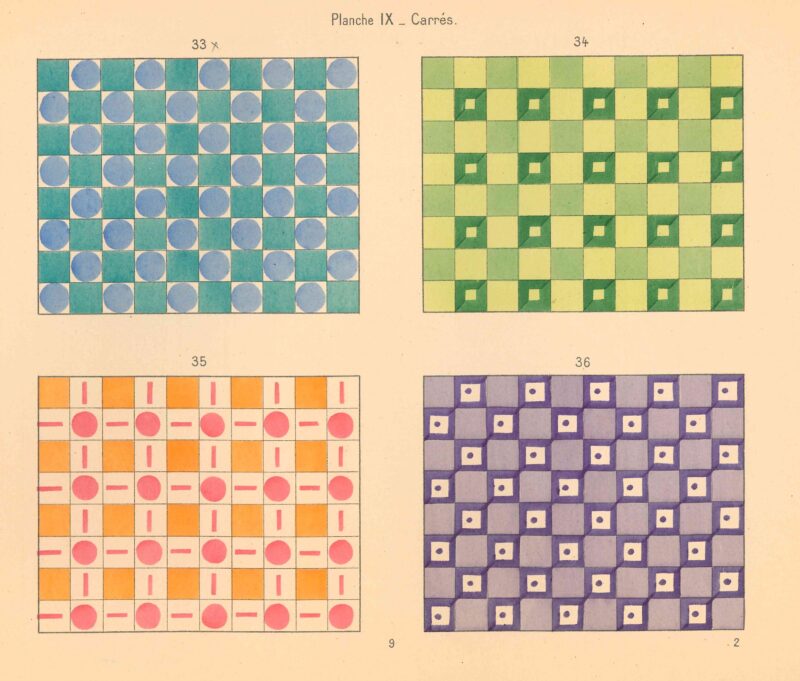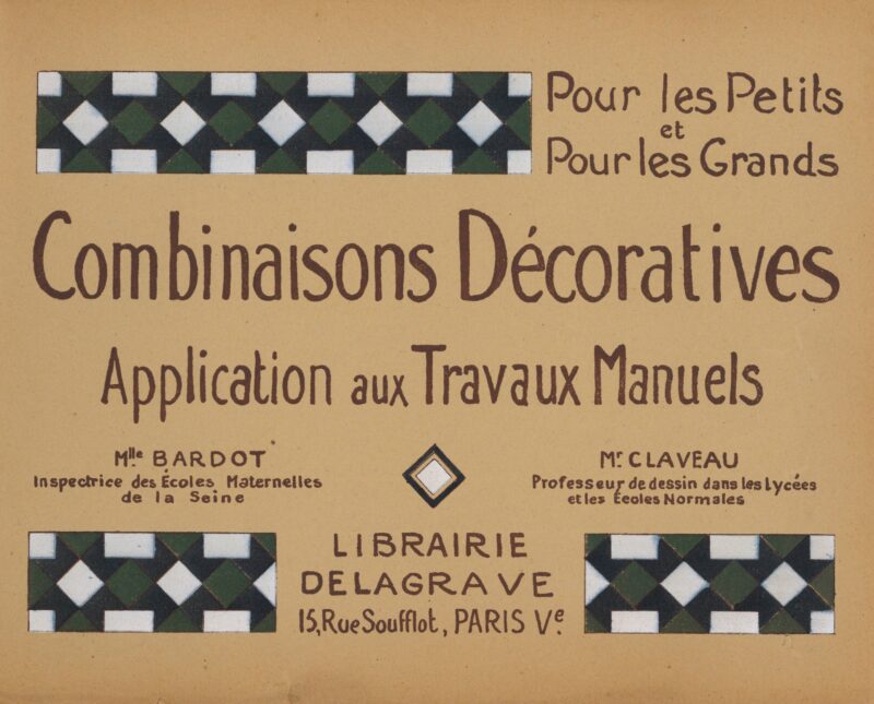 The last item dating to the 1920s is a French early childhood art education manual with 16 original brightly colored pochoir plates. Combinaison Décoratives: Application aux Travaux Manuels, Pour les Petits et Pour les Grands was published in Paris in 1929 as a method for teaching color composition to children. The plates show numerous decorative patterns which were executed by young schoolchildren between the ages of 4 and 8. One of the authors, Madeleine Bardot, served as Inspectrice des Écoles Maternelles de la Seine and was an advocate of “l’education nouvelle”, a movement which, in their words, “prepared children not only to become future citizens capable of fulfilling their duties towards their loved ones and humanity as a whole, but also human beings conscious of their human dignity.” The other author, M. Claveau, was a professor of drawing at the lycées and écoles normales. Together the two selected 64 pieces from the best examples of student work. Many of the outlines were prepared by teachers and filled in by students, but the last few plates were created entirely by children from start to finish. A beautiful work of early childhood education and also color theory.