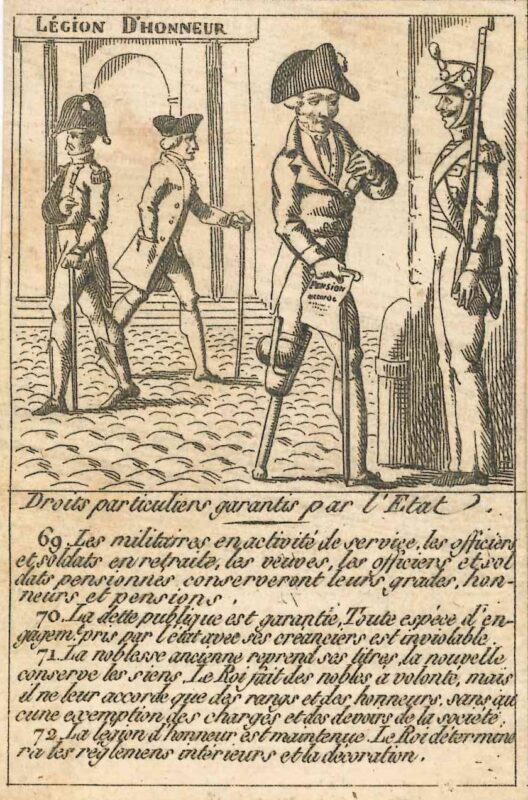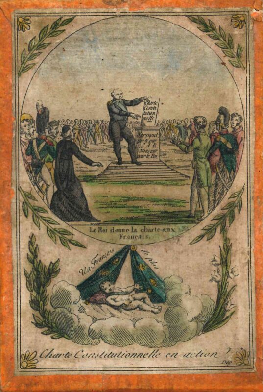 The earliest item in this grouping is a rare set of French historical cards, dedicated to teaching about the Constitutional Charter. The set of 24 cards date from 1814, each with an engraved illustration above several lines of text detailing 2 to 4 of the articles from the Charter, with all 76 articles contained across the 24 cards. This type of series was distributed by the “Marchands de Nouveautés”, a generic name given to a group of print dealers in Paris who usually printed more popular stories such as Robinson Crusoe or Don Quixote. A set of cards such as this one was intended to help eliminate Napoleonic fervor and unite France under a renewed sympathy for and belief in the monarchy. A very scarce set in its original cardboard box with engraved and hand-colored vignette to lid.