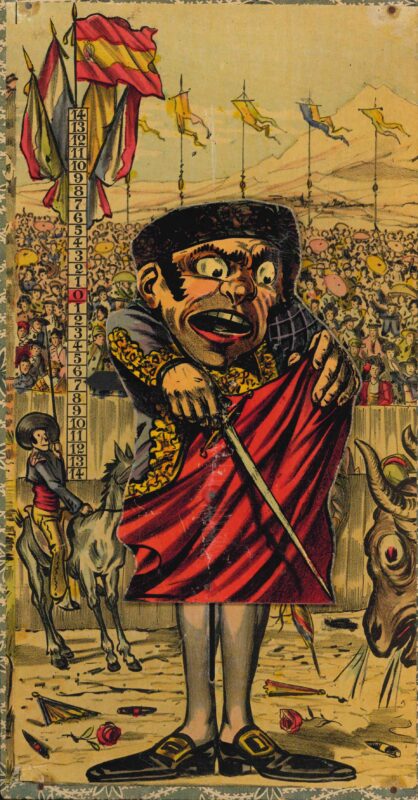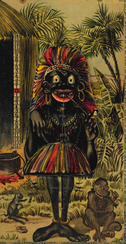 Our fourth object is a larger-format board game dating to right around the turn-of-the-century. Titled ‘Les Nains-Géants’, or ‘The Dwarf Giants’, this humorous game has players keep track of their points using a large chromolithographed caricature-style figure which slide up and down along a scoring track, making the figures ‘grow’ and ‘shrink’. Whoever reaches the top of their tracker first wins the game. The characters in the game include a jockey, a postman, a matador, a farmer, a soldier, and a “tribal” style Black man in front of a hut. The box lid also includes a racial stereotype in its cover illustration depiction of a Black man and a circus clown. The game was published by Saussine, a well-known Parisian game manufacturer, and was designed by Eugene Serre, one of Saussine’s greatest illustrators.