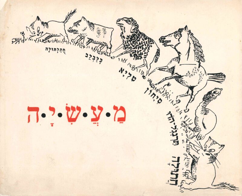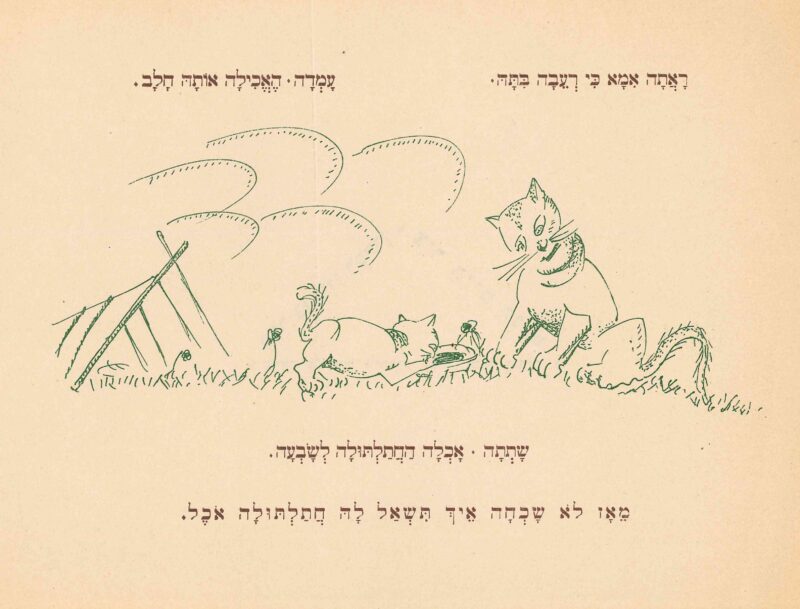Next up are a few various items dating to the 1920s. The first of these is a rare Hebrew-language children’s book published in Warsaw around 1922. The book was written by Bentsiyon Raskin (also known as Ben Zion Raskin), one of the leaders of the Zionist movement in Warsaw, and illustrated by Chaim Hanft, a member of the Warsaw School of Fine Arts. The book tells the story of a kitten who played with other animals until she grew hungry, and realized she had forgotten how to ask for food. It was published as part of Raskin’s “Zil Zlil” series of five children’s books.