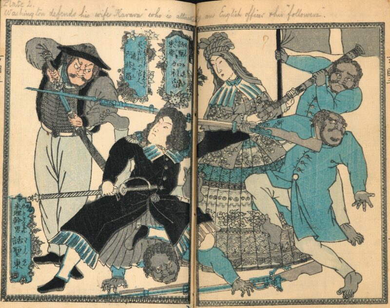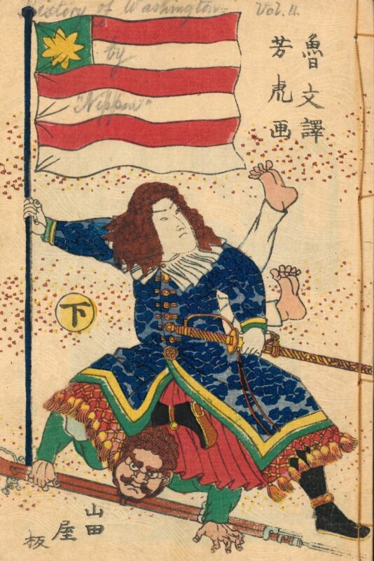 The second item is a whimsical and bizarre illustrated alternative American history from Japan called Osanaetoki Bankokubanashi. Dating to 1861, this unusual and rare set of four booklets translate loosely as “The History of Washington”. Written by Kanagaki Robun and illustrated by Utagawa Yoshitora, this fascinating series describes and depicts scenes where Christopher Columbus discovers America and defeats mutineers, but then shows George Washington, John Adams, and Benjamin Franklin as superhero-like figures who punch tigers, defeat dragons, and kill giant snakes who eat people. This set was issued shortly after Commodore Perry’s arrival in Japan, when interest in America was high but direct experience with America was still virtually non-existent – and so Japanese writers could imagine up fantastical tales and visions of grotesque monsters, evil villains, and peaceful goddesses existing in that exotic land.