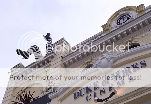 Such detours make one nostalgic for a time when cinemas were places of fantasy and seduction, their architecture reflecting the otherworldly allure of the stars and films screened inside them. Thankfully, even in today's era of sterile multiplexes one of Brighton's historic cinemas is still operating: the Duke of Yorks (recognised by the BFI as one of the oldest surviving in the country), a building distinguishable by the pair of stripey stockinged dancer's legs which protrude from its roof. The legs are a relatively recent addition, having been transplanted from another cinema in Oxford in 1991; nevertheless they offer a rare glimpse of that gaiety which has been lost elsewhere, onscreen as in life. It is as if the energy of the cinema's interior world cannot be contained and has literally burst out, transforming the drabbest of skies into a dramatic backdrop. Rumour has it the legs even kick of their own accord on special occasions...