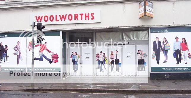 The vacant Woolworths premises in our high street have been 'improved' by the local Council in the form of a series of pictures of elated imaginary shoppers pasted over the doors and windows. The actors are captured in that Utopian space typical of advertising, forever exiting the store of their dreams, in blissful ignorance of the reality behind them. Their generic smiles and giftbags suggest that a recession, or indeed any kind of existence outside the realm of consumption, is something entirely alien to them, no more thinkable than life on another planet.
