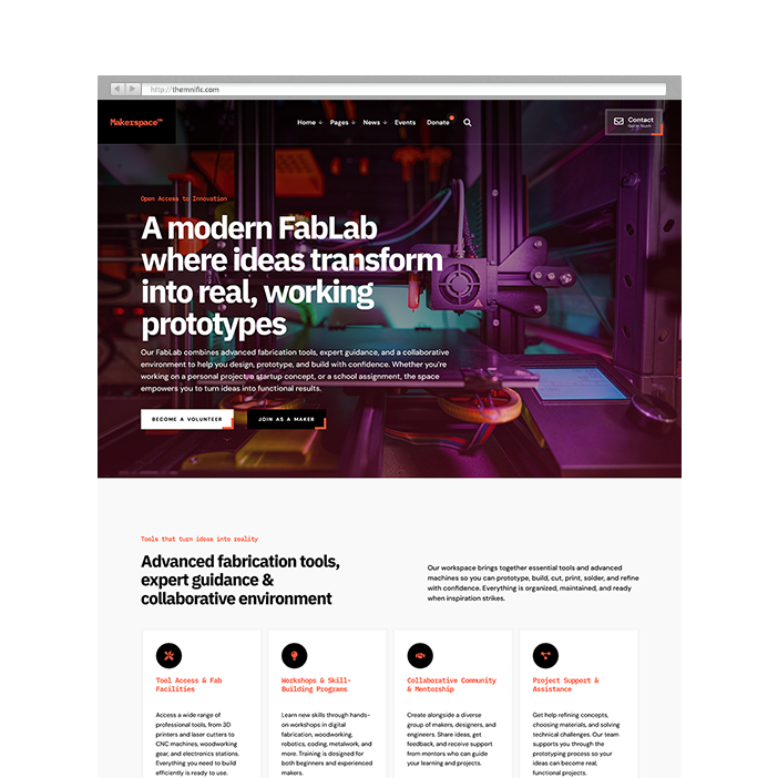 Makerspace is not a multipurpose theme adapted for workshops — it’s designed from the ground up for fabrication-focused spaces. The demo content includes layouts for tool highlights, events, workshops, donation sections, FAQs, blog content, team members, sponsors, testimonials, and community statistics.