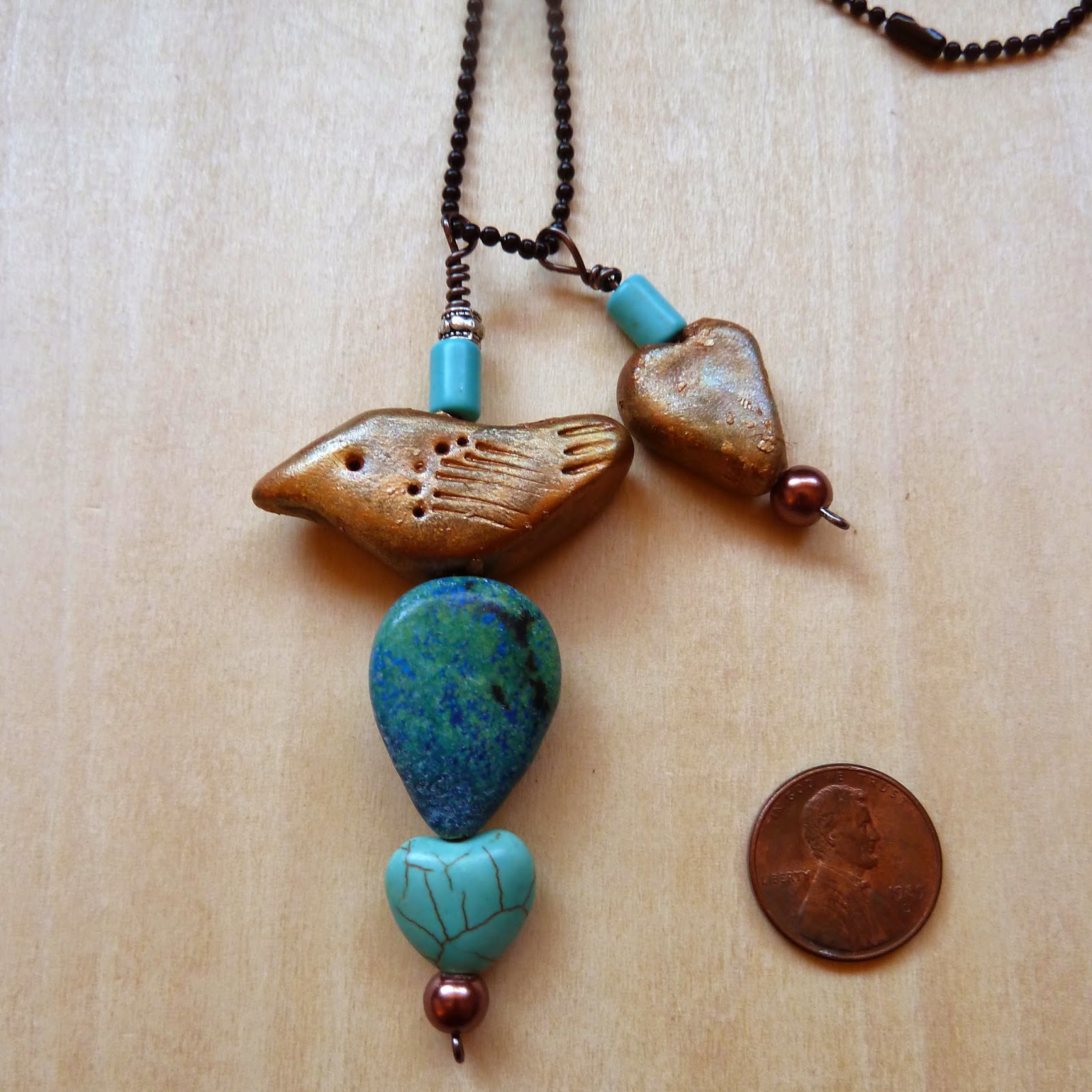 I've been trying to make a little something pretty every day, whether it's a doodle, a bead thing, a paper toy, a painting or a cake. Today was this page of stampy farm animals made with tiny foam stickers I bought at the Dollar Tree. Here is a little pendant I made. I molded the bird and heart from baked clay then textured them with gold paint. I've put some of my "makings" up for sale in my etsy shop. https://www.etsy.com/shop/TheToymaker