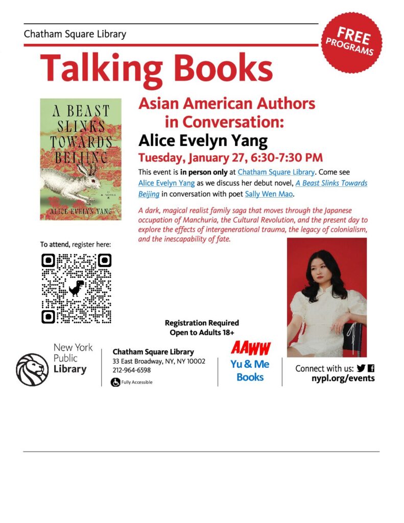 Join the New York Public Library, Yu & Me Books, and AAWW for a celebration of A Beast Slinks Towards Beijing by Alice Evelyn Yang, featuring Sally Wen Mao!
