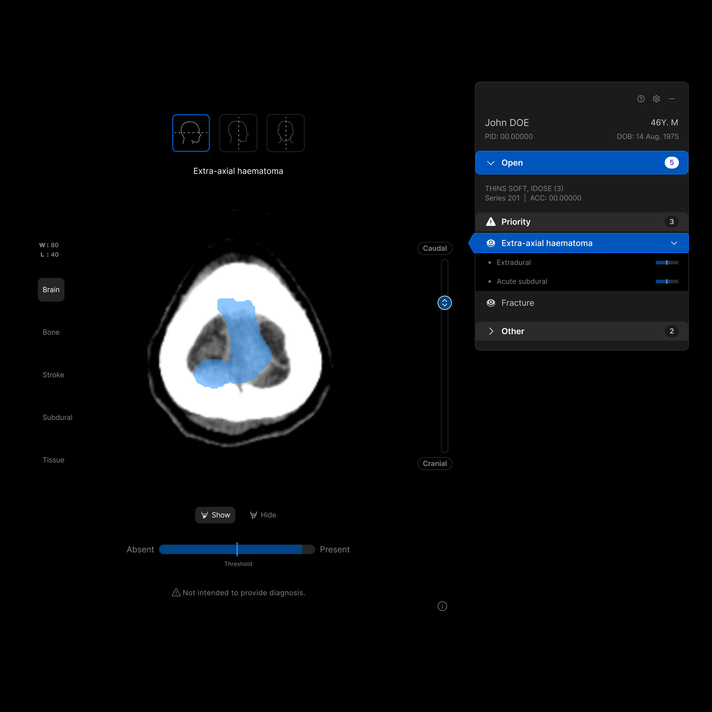 A comprehensive decision-support AI solution for non-contrast head CT studies, that detects up to 130 findings in under 90 seconds.