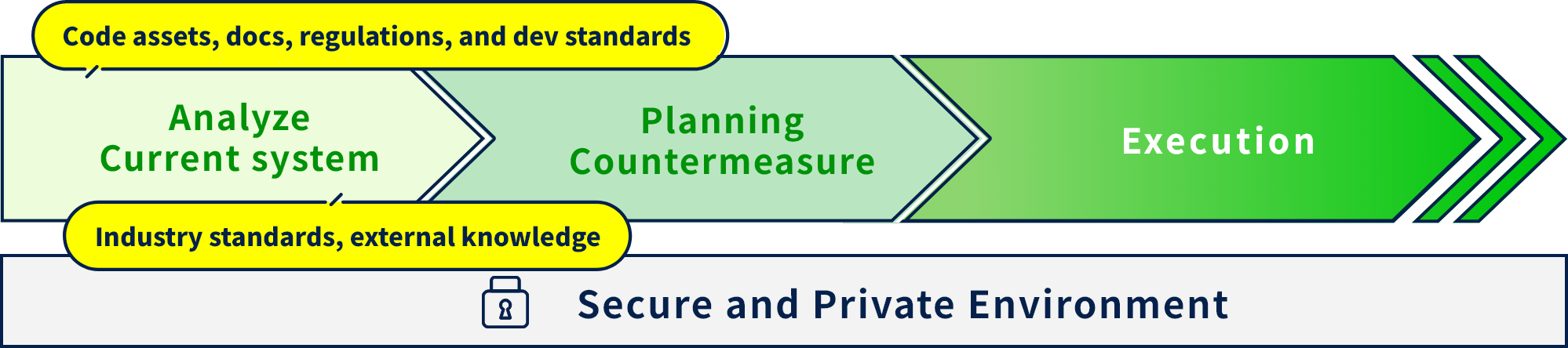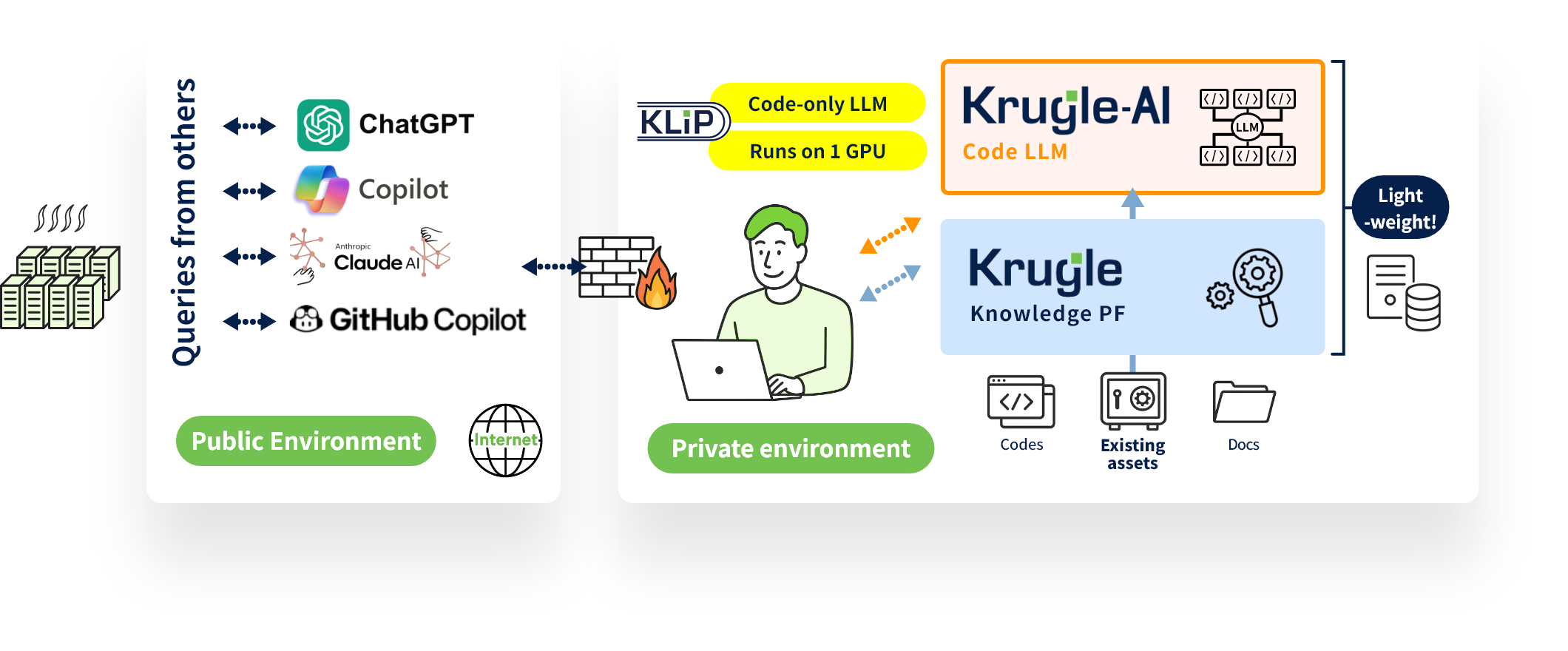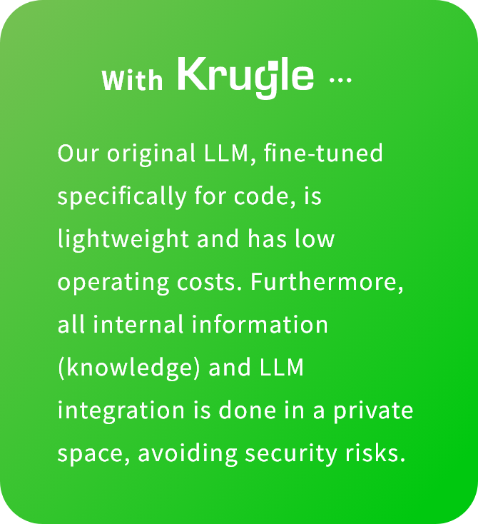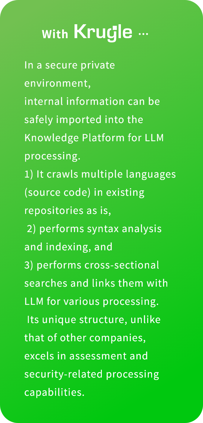 The code, specifications, design documents, and related information of existing systems are generally confidential. The Krugle platform completes all processing in a secure, private environment, enabling extensive AI use for maintenance and modernization.