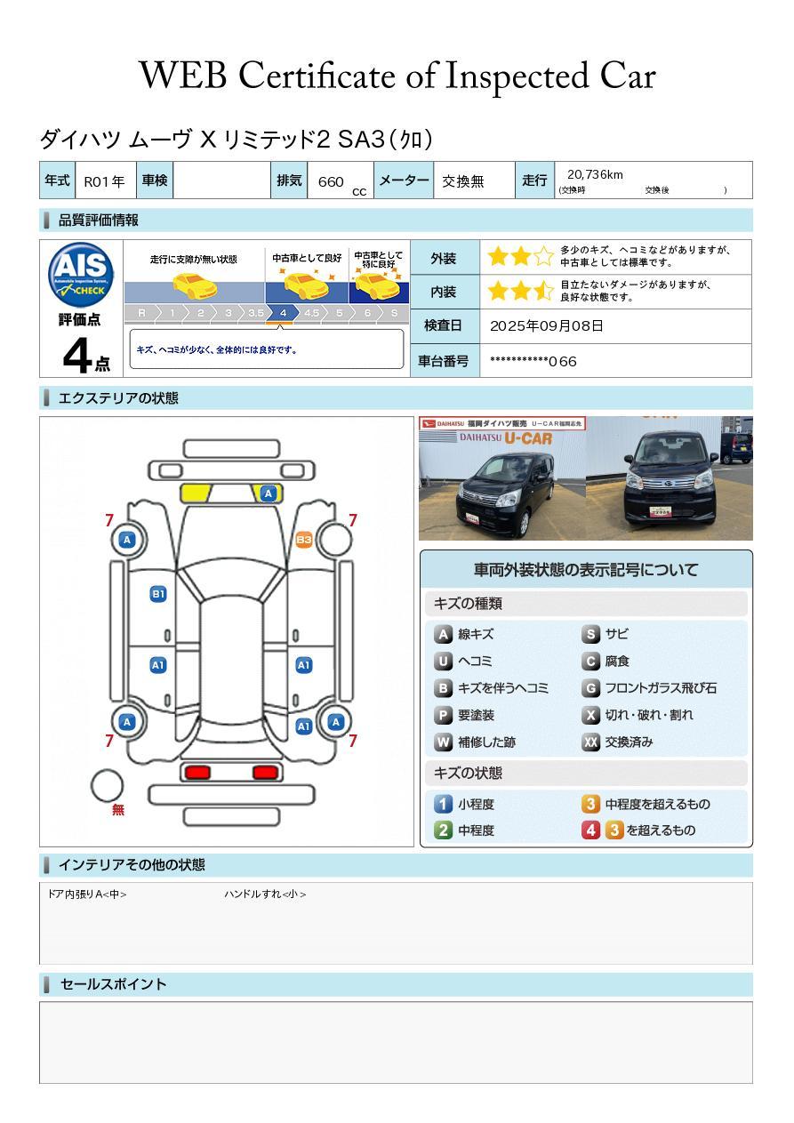 車両状態証明書が付いておりますので、安心してお選び出来ます。詳しくは、スタッフまでお気軽にお問合せください。