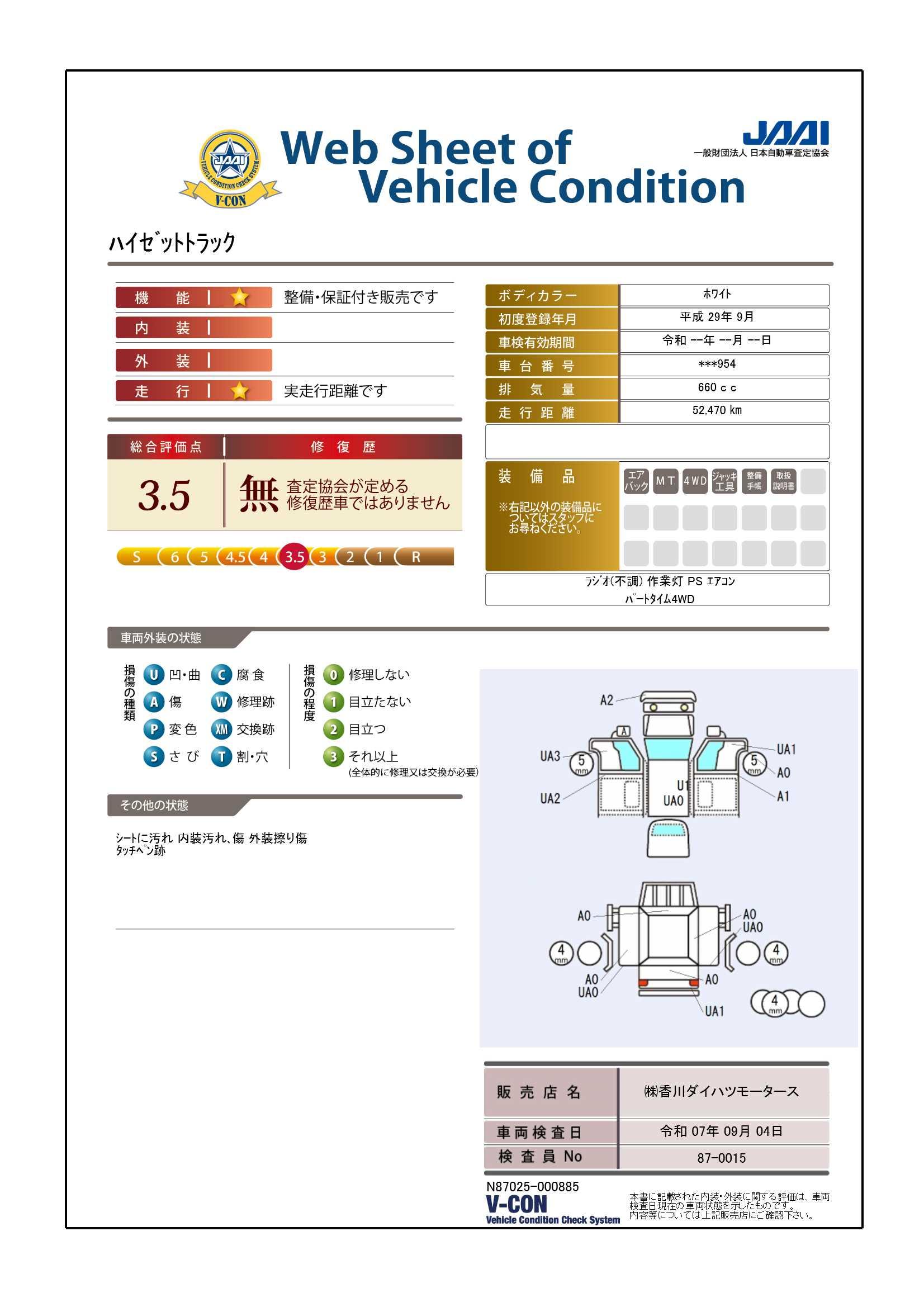 車両状態証明書の見方となります。検査団体によって、表記方法が異なりますので該当車両の車両状態証明書を御確認の上、ご覧ください。