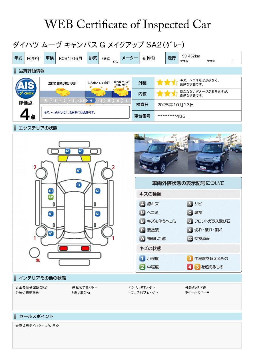 車両状態証明書が付いておりますので、安心してお選び出来ます。詳しくは、スタッフまでお気軽にお問合せください。