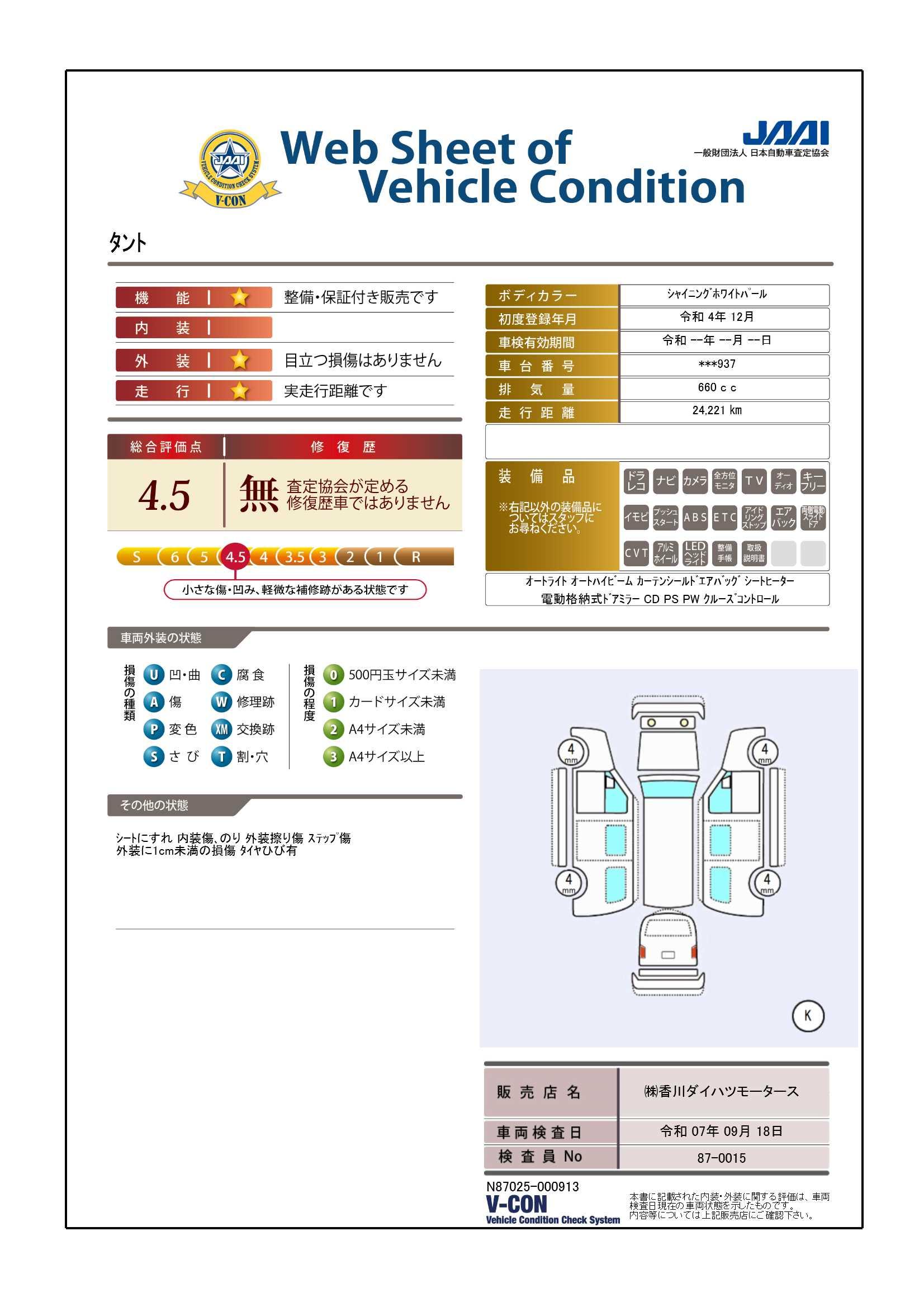 車両状態証明書の見方となります。検査団体によって、表記方法が異なりますので該当車両の車両状態証明書を御確認の上、ご覧ください。