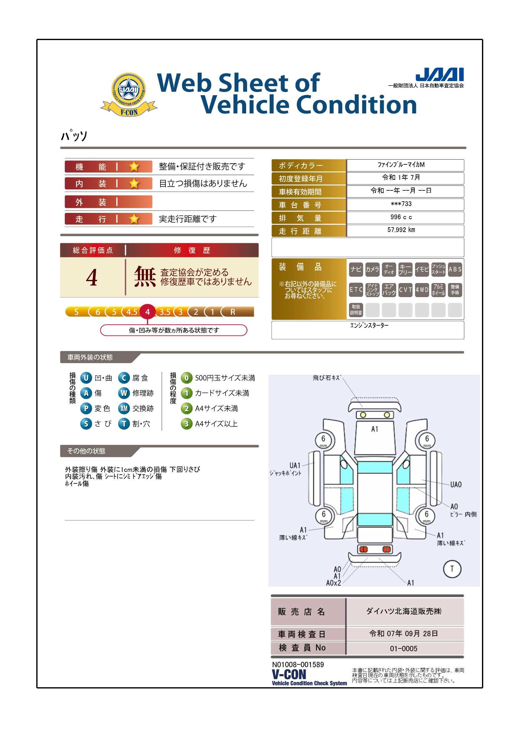 中古車をお選びいただく際に気になる走行距離や修復歴などに加えてキズ・凹みの有無・状態や消耗品の交換、今までの整備状況が “ダイハツ認定中古車カルテ”でわかります。