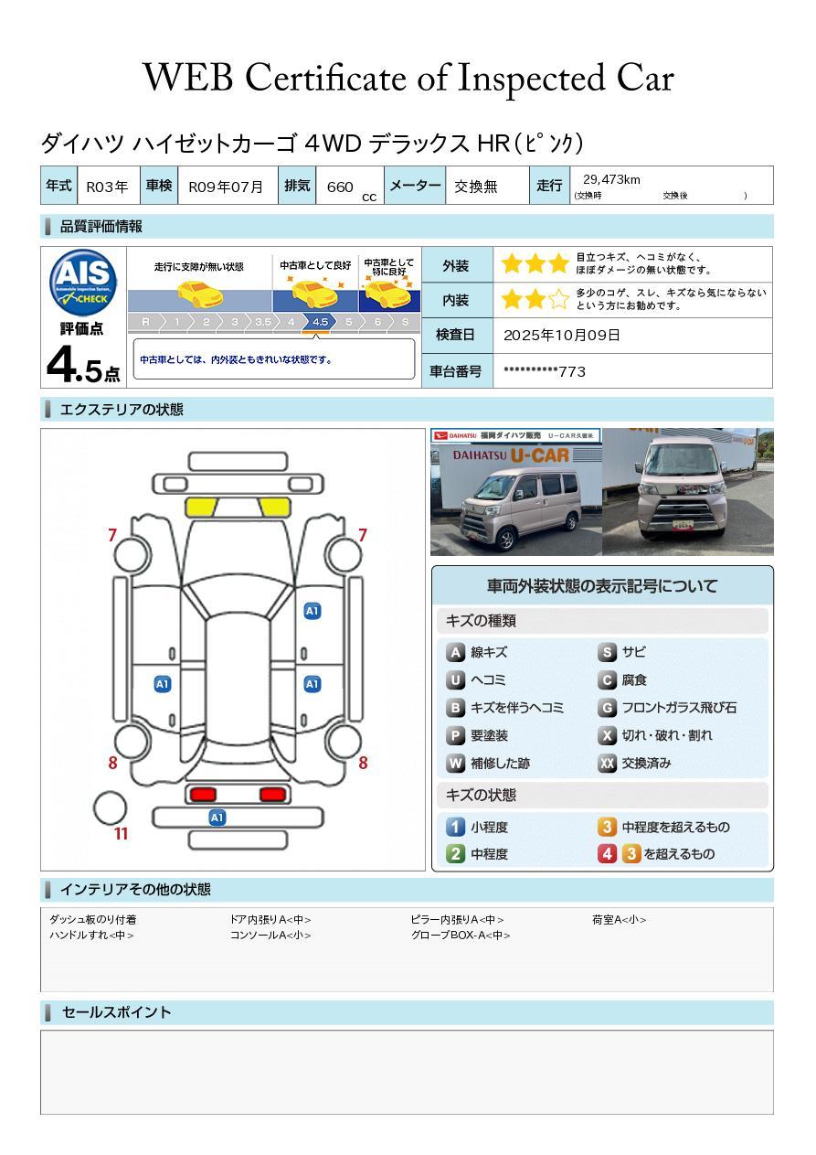 車両状態証明書が付いておりますので、安心してお選び出来ます。詳しくは、スタッフまでお気軽にお問合せください。