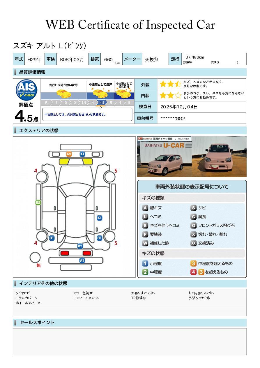 車両状態証明書が付いておりますので、安心してお選び出来ます。詳しくは、スタッフまでお気軽にお問合せください。