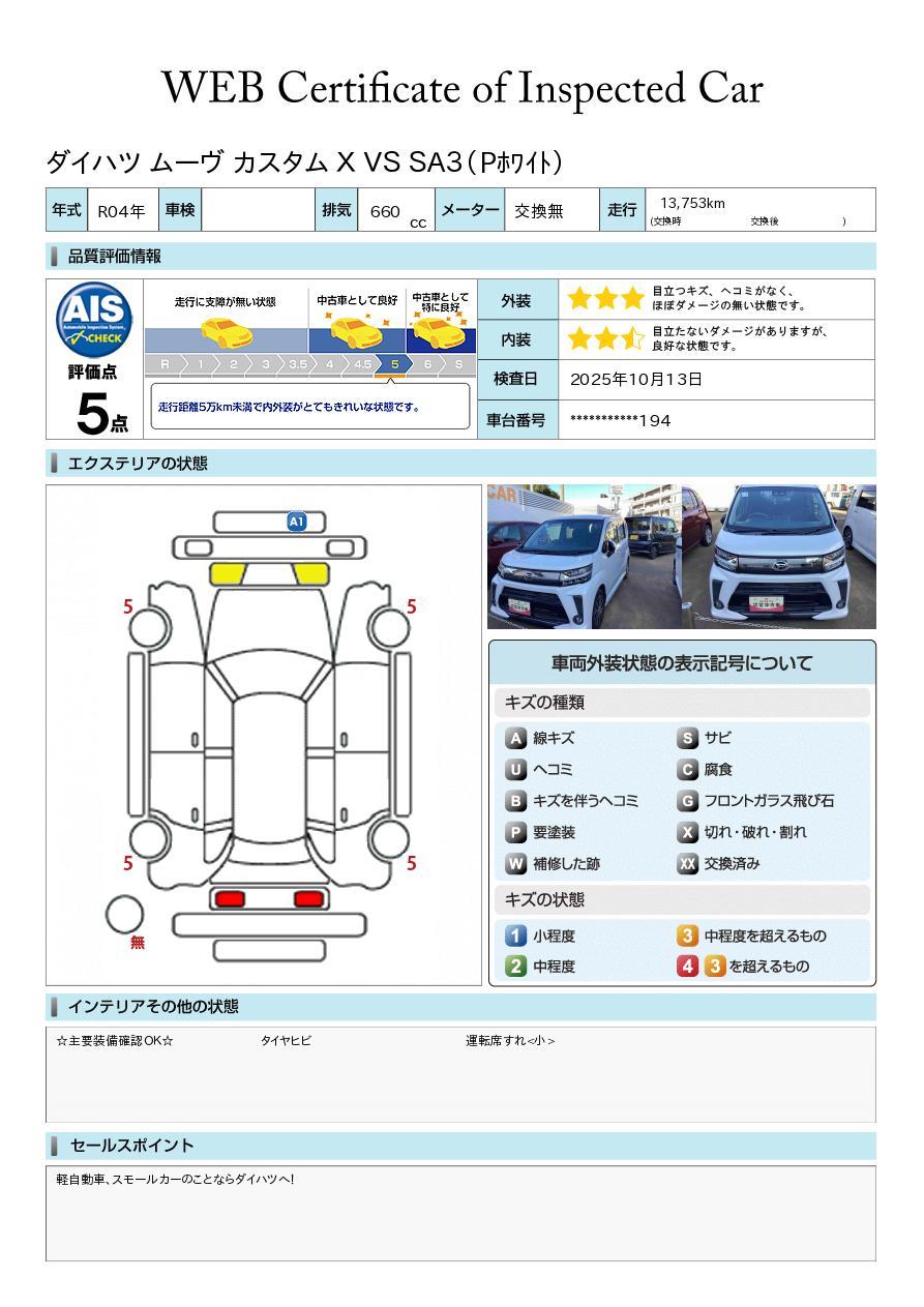 車両状態証明書が付いておりますので、安心してお選び出来ます。詳しくは、スタッフまでお気軽にお問合せください。