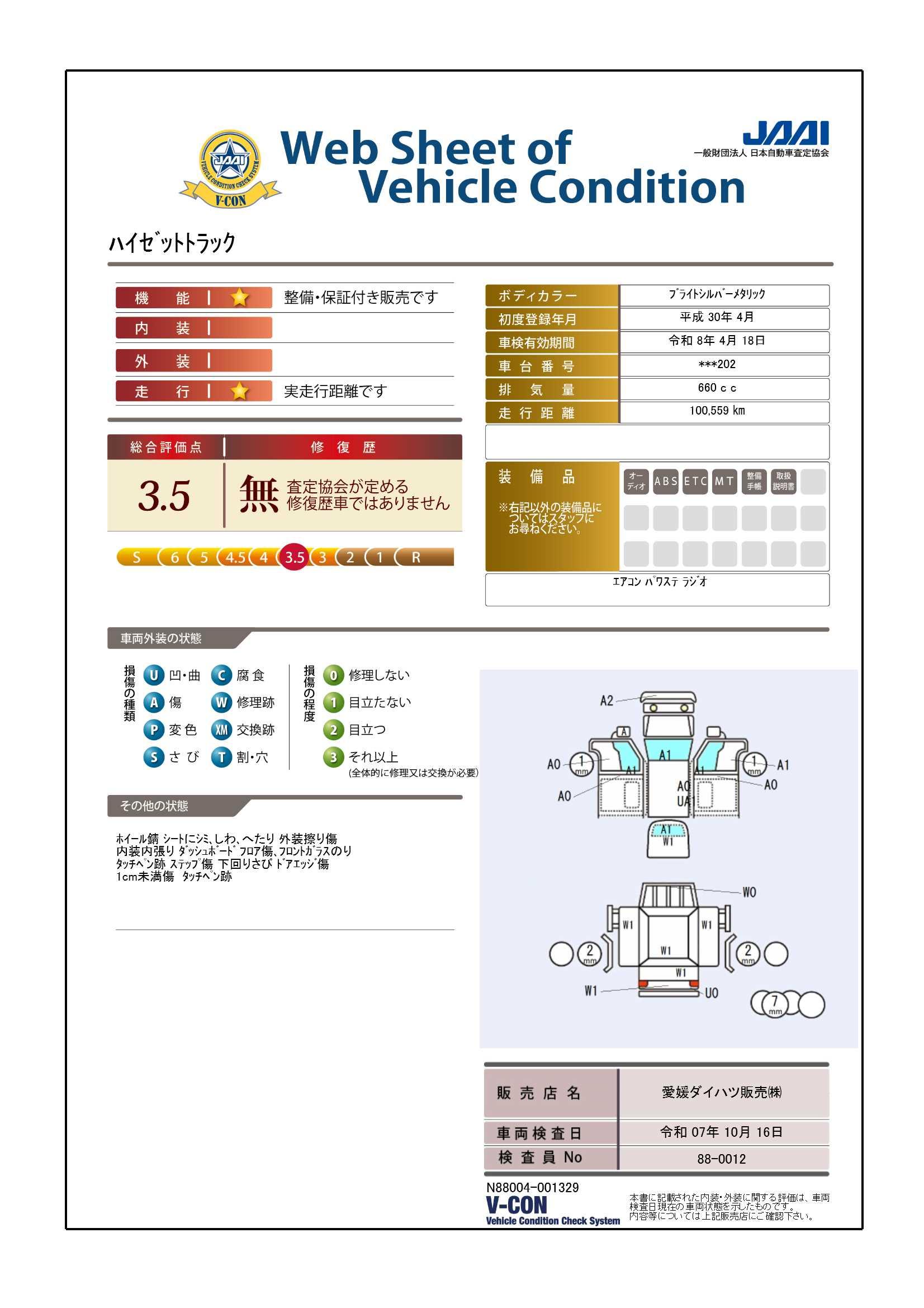 保証項目コメント | 新車メーカー保証に準じた保証(エンジン・エアコン・トランスミッション他)を1年間無償で受けられます。さらに、別途有償保証の「まごころ保証プラス」「まごころ保証プラスα」をご用意しております。 | ||
