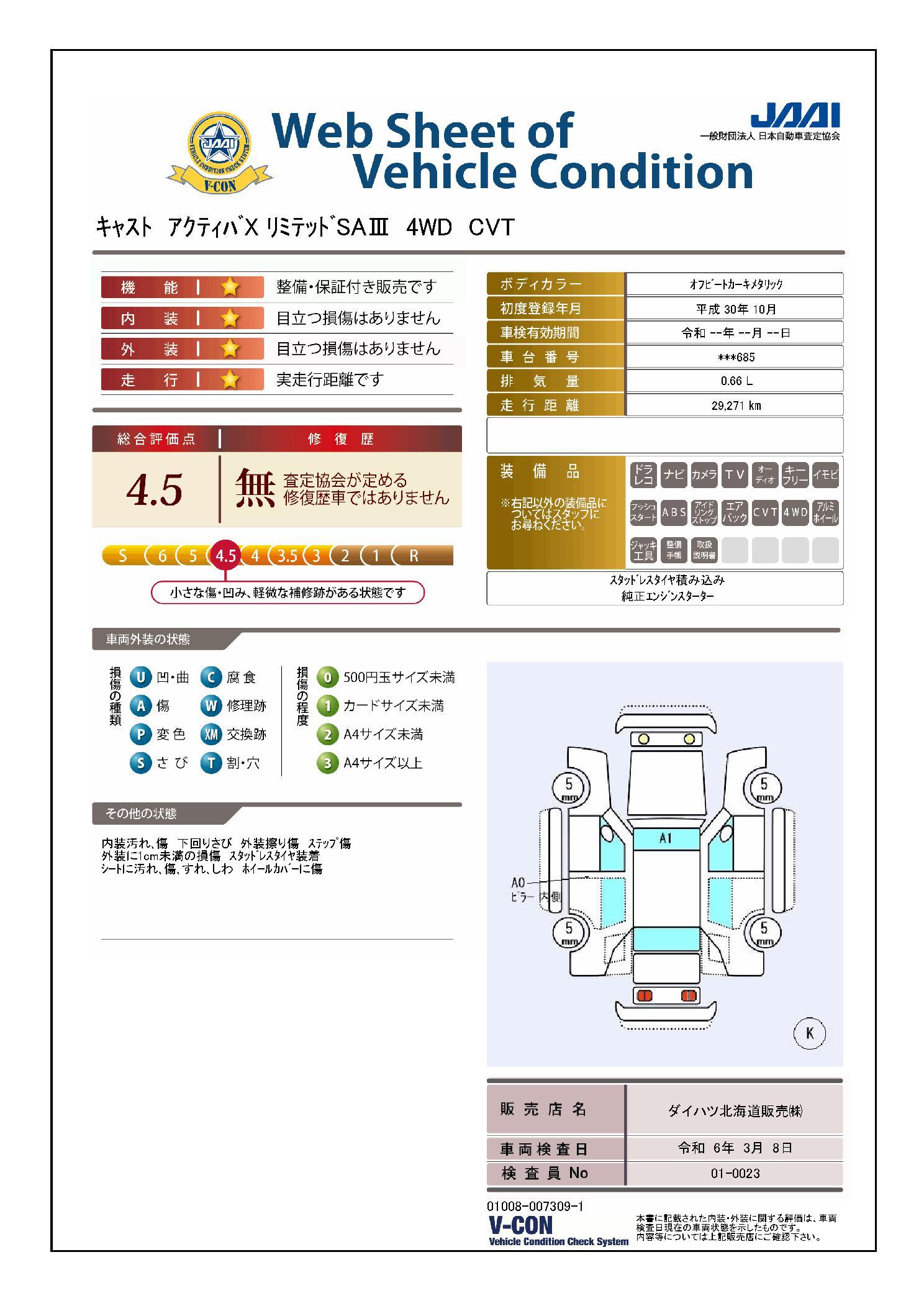 一般財団法人 日本自動車査定協会の車両状態証明書となります。