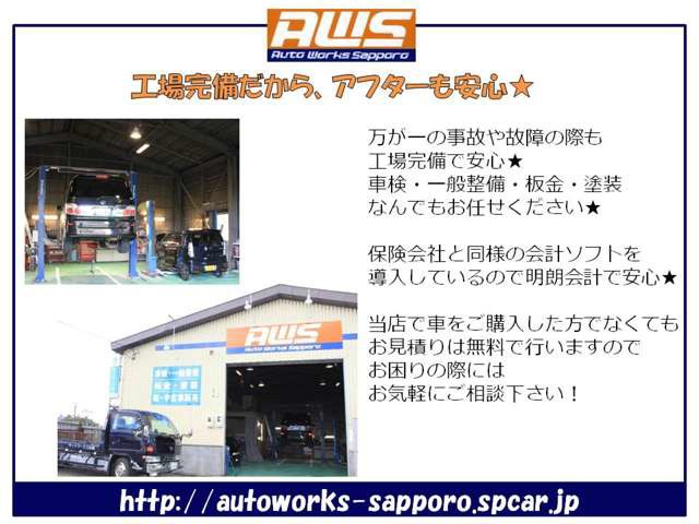 創業27年の (株)オートワークス札幌と申します! 板金・塗装・整備、30年以上の実務経験を活かし、一台一台厳選して仕入れたお車を、 お客様にご提供させて頂いております。 【SUZUKI販売店及び修理・整備認定工場・SUZUKIシステム導入店・SUZUKI故障診断機…