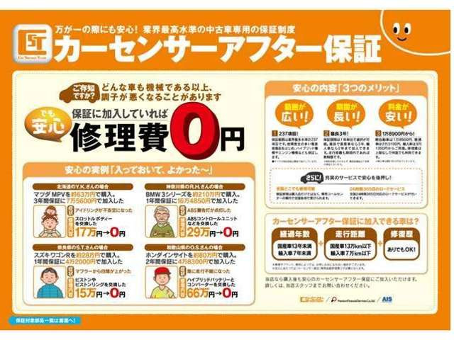 保証が付いています。車両価格には購入後の保証費用が含まれており、保証書が交付されます。保証条件や内容は販売店によって異なりますので、詳しくは各販売店へお問い合わせください。