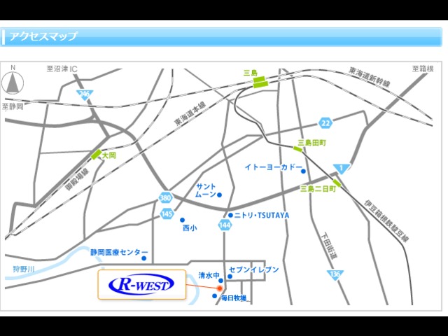 R-WEST 〒411-0918 静岡県駿東郡清水町湯川10-59 055-973-7177 [ 営業時間 ] 10:00〜19:00 [ 定休日 ] 不定休 お車でお越しの方 東名高速道路 沼津ICを降り、国道1号線で三島・下田方面へ約15分です。 TSUTAYA・ニトリの交差点(清水町玉川)を右折。 約1km…