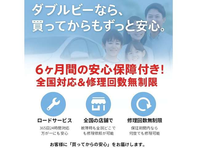 保証が付いています。車両価格には購入後の保証費用が含まれており、保証書が交付されます。保証条件や内容は販売店によって異なりますので、詳しくは各販売店へお問い合わせください。
