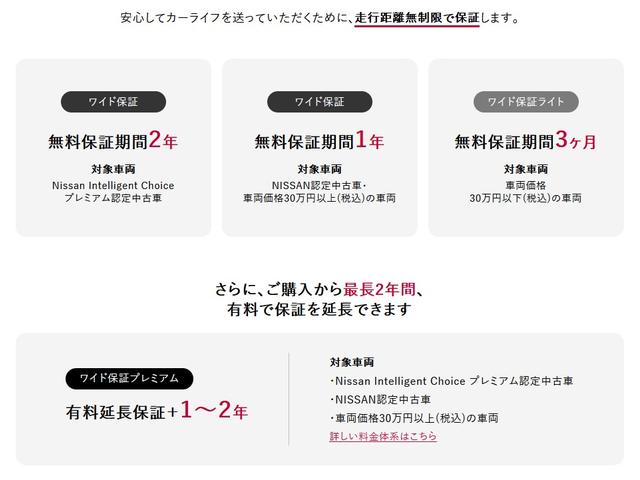 保証が付いています。車両価格には購入後の保証費用が含まれており、保証書が交付されます。保証条件や内容は販売店によって異なりますので、詳しくは各販売店へお問い合わせください。