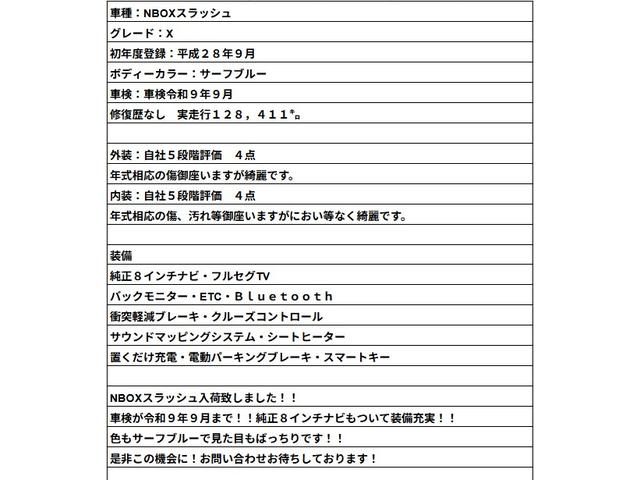 N−BOXスラッシュ X 車検令和9年9月/純正8インチナビ/Bluetooth/バックモニター/衝突軽減ブレーキ/ETC
