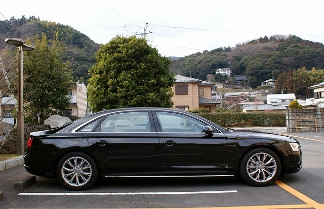 ゆとりのある駐車場に「A8L」を収めても、5275mmもある全長では、収まりきらない。