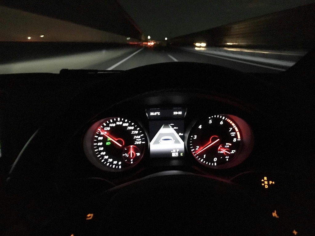 100km/hでエンジン回転数1600rpm。静々と矢のように走る巡航性能はメルセデスらしい