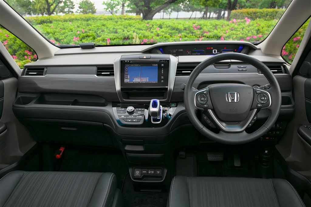 インテリアの基本造形はフリードと同じ。本革巻きステアリングもEXには標準装備