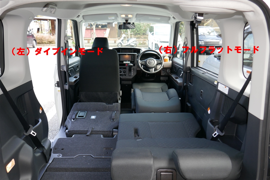 手間がかかる後席ダイブ操作。後席はソリオ以上に倒れるので仮眠向き。
