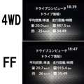 燃費については、カタログ数値から見て4WDに対してFFは、5km/lくらい上回るかと想像していたのですが、私の走る道での実燃費では、そんなに差は無くて、4WDの約20km/lに対して、FFで頑張っても最終的には21km/lに届きませんでした。短い距離で測ると電池の状態やその日の気温の差で誤差が大きくなるので、同じ道を同じように何往復も走っての平均値なので気温(冬季のため同じように暖房を使用)による誤差も無いと思います。 機械式の4WDのようなメカのロスが無いのと後輪からの電力回生(下り坂など)が効いているのかも知れません。