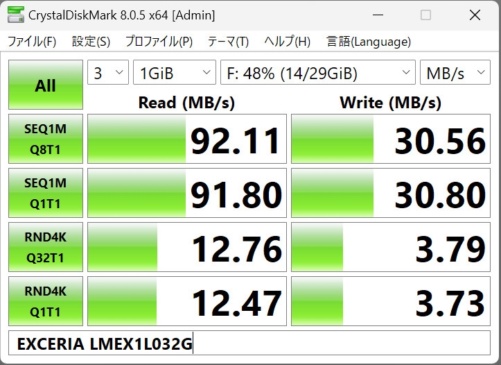 『CrystalDiskMarkの結果(一例)』キオクシア EXCERIA LMEX1L032GG2 [32GB] 鴻池賢三さんのレビュー・評価画像1/3