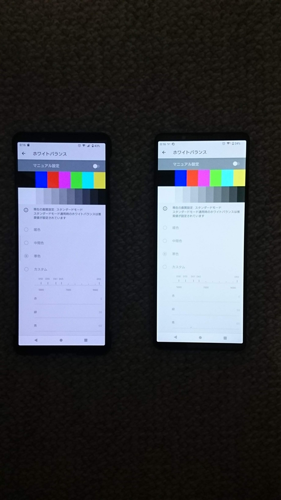 左が交換品で右が不良品。同じ輝度とホワイトバランス設定