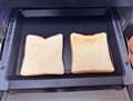 トーストを4分間焼いたところ。右側が裏面だがほのかに焼き色が付いている。 |
