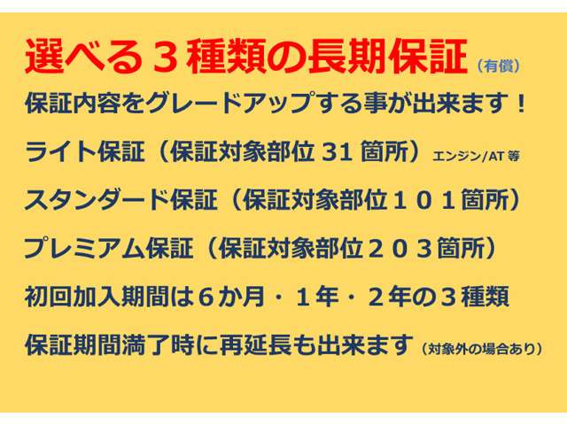 保証が付いています。車両価格には購入後の保証費用が含まれており、保証書が交付されます。保証条件や内容は販売店によって異なりますので、詳しくは各販売店へお問い合わせください。