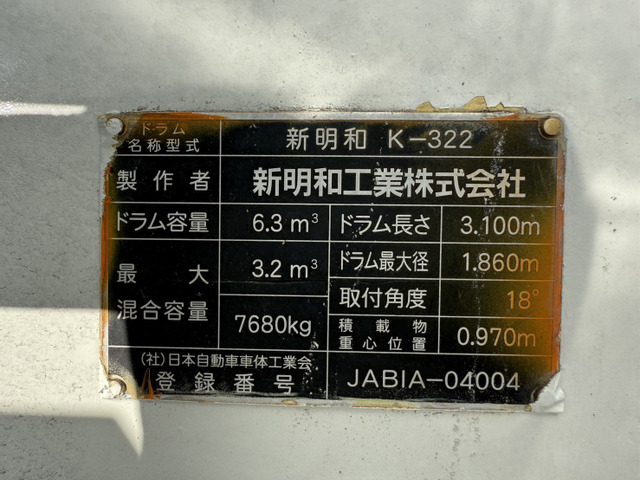 ■お問合せ番号【P587】 ※お問合せの際は、上記お問合せ番号をお伝えください。 ********2023年10月1日より支払総額義務化となりました******** 【支払総額】には、諸費用が含まれております。 車両本体のみのお渡しも可能となりますので、お問合せください。 *********************************************************** 今回の出品は外装仕上げ済み!!増トン!!生コン車!!レンジャー新明和製コンクリートミキサー車6.3立米電動スランプガード付になります!! ★格安塗装承ります(ご相談ください) ★外装仕上げ済み!! ★増トン!! ★車検付!!令和8年4月10日迄 ★リーフサス ★実走行 ★6400cc(ターボ230馬力) ★2人乗り ★ミッション 6速マニュアル ★積載8080kg ★コンクリートミキサー車/生コン車 ★電動スランプガード/ホッパーカバー ★水タンク ★上物 新明和製 MW322-35 ★ドラム 新明和製 K-322 ドラム容量6.3立米 最大混合容量3.2立…