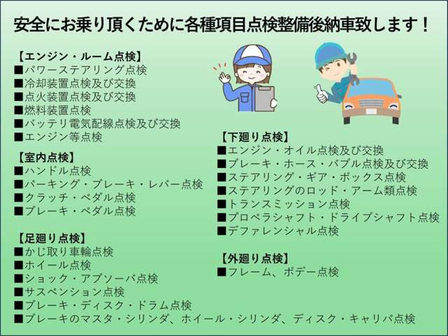 販売店が納車(展示)時までに定期点検整備(自家用乗用車の場合は、法定12ヵ月点検整備または法定24ヵ月点検整備)を実施します。