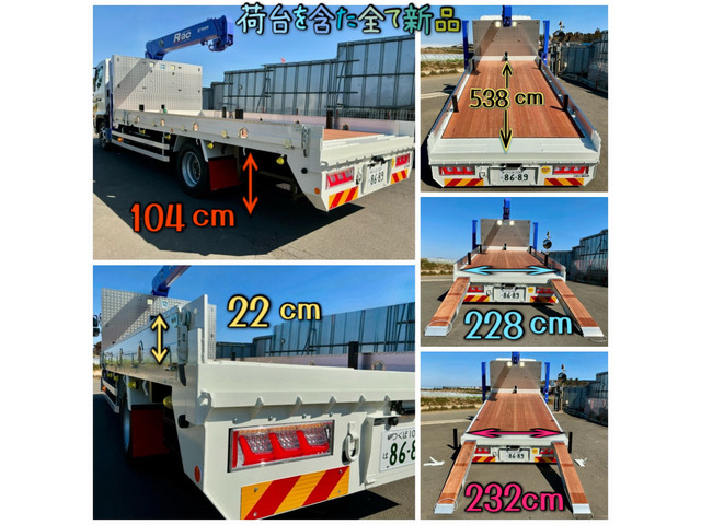 ★レンジャー・増トン・ハイジャッキ。 ★12ヶ月法定点検実施後、必要整備を行い、車検取得済み。 ★記録簿在 ★車検令和9年3月8日まで。 ★タダノZR363SLセルフクレーン3段 ★フックイン ★ラジコン付。 ★強化ボディ新品。 ★新品滑車付 ★新品昭和アルミブリッジセット付き。 ★新品テールランプ小糸LED。 ★マーカーランプ全て、作業灯 新品LED。 ★全塗装済 ★ルームクリーニング済み。 ★AC ★PS ★PW ★ABS ★AIRBAG ★ETC ★バックカメラ。 ★エンジン6400? ★225馬力ターボ ★6速MT。 ★実走行 202699? ★最大積載量7200kg。 ★荷台寸法:長さ538cm ★幅228cm アオリの高さ22cm。 ★アオリを開けた時の荷台幅232cm。 ★リアアオリ取付可能。 ★タテネタ4.5mm/75mm/75mm角パイプ。 ★ヨコネタ5mm/40mm/75mmチャンネル。 ★床板アピトン。 ★ご覧頂きありがとうございます。 ■この車への「お問合せ」・「無料見積り依頼」、「在庫確認」は、お気軽…