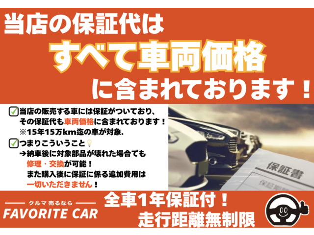 保証が付いています。車両価格には購入後の保証費用が含まれており、保証書が交付されます。保証条件や内容は販売店によって異なりますので、詳しくは各販売店へお問い合わせください。