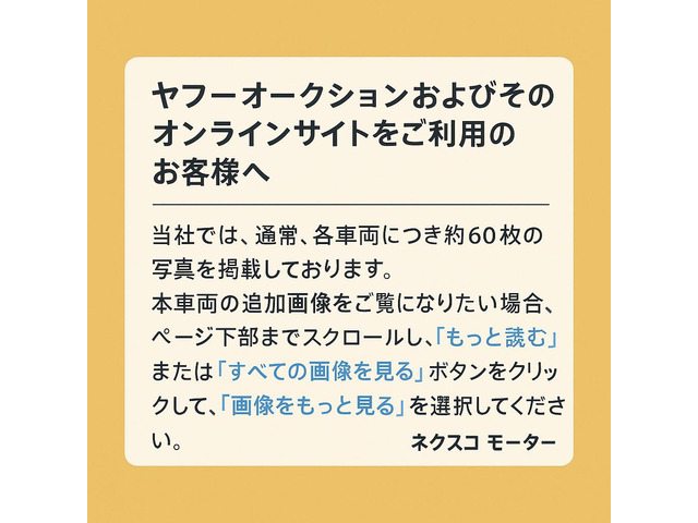 ご覧頂きありがとうございます。 ■この車への「お問合せ」・「無料見積り依頼」、「在庫確認」は、お気軽にどうぞ! ■この車両以外にも「車選びドットコム」におすすめの中古車を掲載しております。 他の在庫車種、お店へのアクセスは【 https://www.kurumaerabi.com/shop/detail/25999/car/ 】をご覧ください。 店頭商談中・売約済の場合もありますので、ご来店の際は事前にお問合せ頂き、該当車両の有無をご確認ください。 提供サービス内容 ★ 車両のみの販売 ★ 予備検査付き販売 ★ 総額販売の対応 ★ 買取および下取りも歓迎 __________________________ 追加の特典とサービス ★ 現車確認対応 お電話で事前予約いただければ、現車をご確認いただけます。 ★ ヤフオク未経験者サポート ヤフーIDをお持ちでない方や入札に不安がある方もお電話でサポート可能です。 車両状態について 外装・内装 ★ 車両の年式に応じて、多少の汚れや小さな傷がある場…