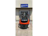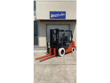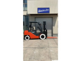 トヨタのフォークリフトです。パワフルなディーゼル車で、アタッチメントにサイドシフトが付いており、荷物を抱えたままあと少し左右にずらしたい時など、運転席からレバー操作でバックレストごと爪を左右に動かせるため、かなり重宝します!